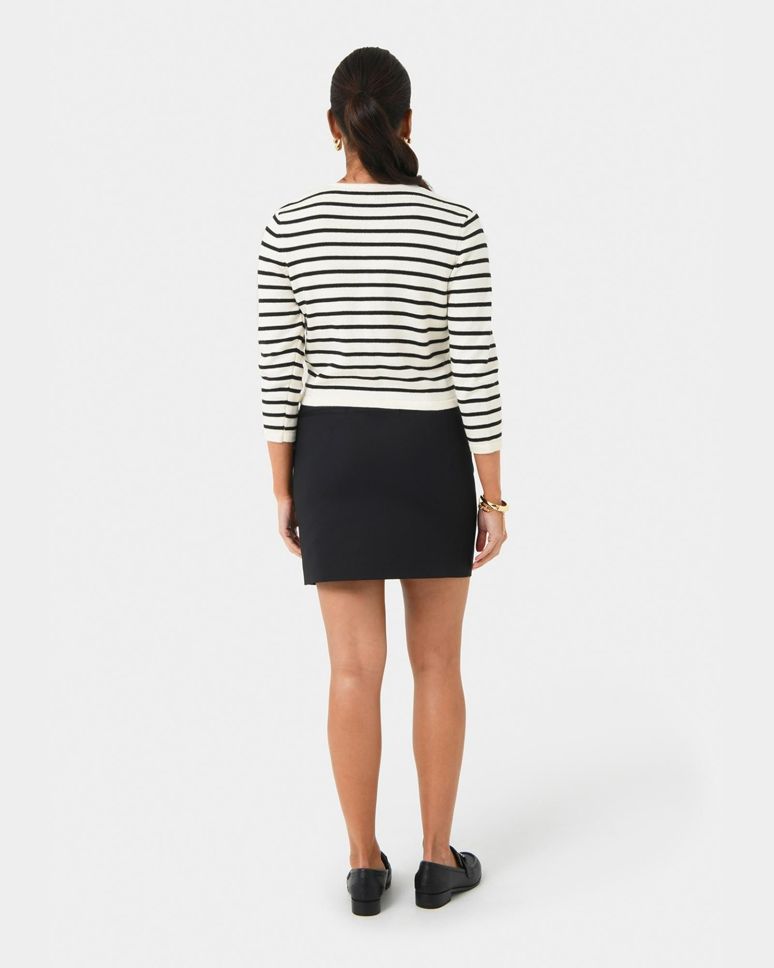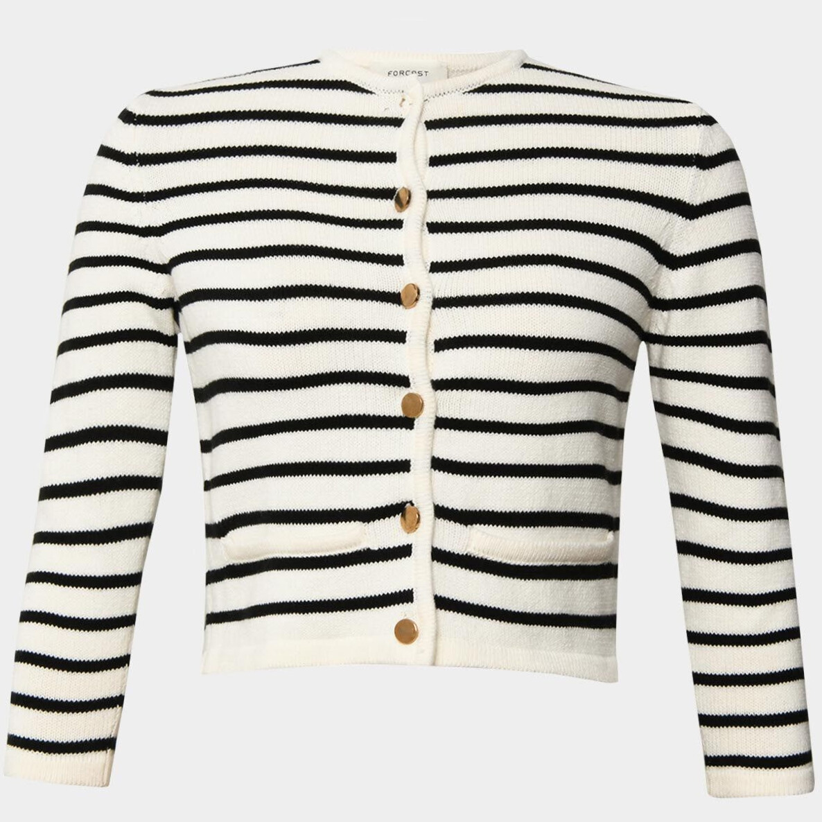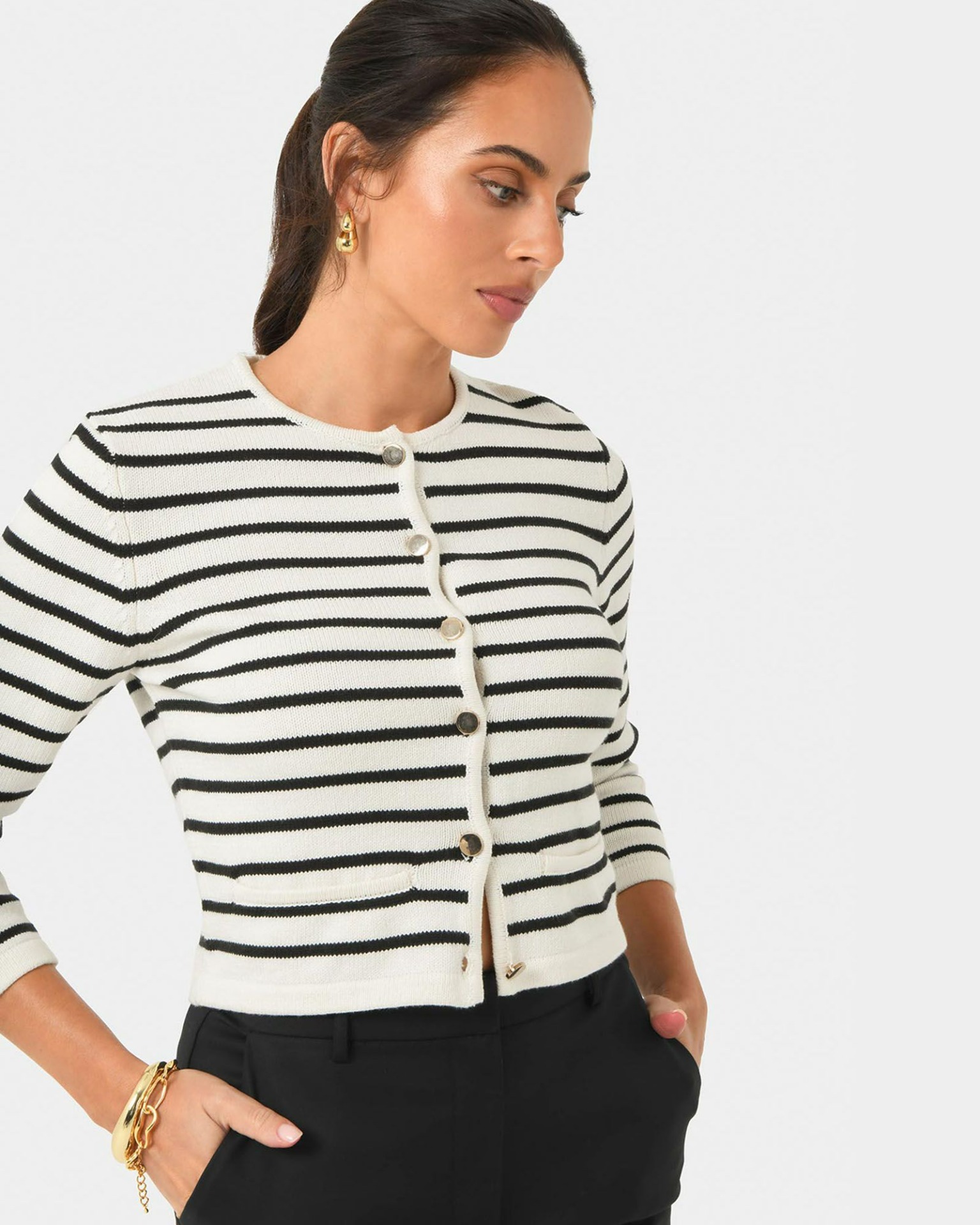 The Tokyo Crop Cardigan features a bold stripe design and a sleek cropped silhouette, striking the perfect balance between modern and timeless. Crafted from medium weight knitted fabric, it offers a soft, breathable feel that is ideal for layering. The button front closure and round neckline add a clean, structured finish. Pair it with high-waisted jeans for a laid-back look or wear with a skirt and tailored pants for class and sophistication.